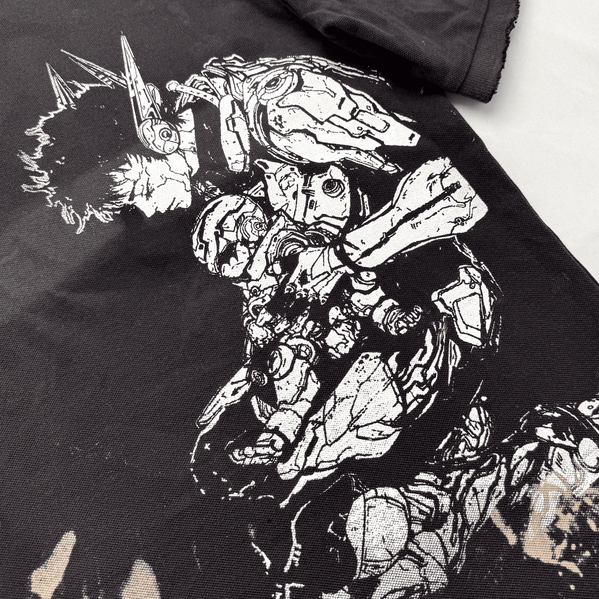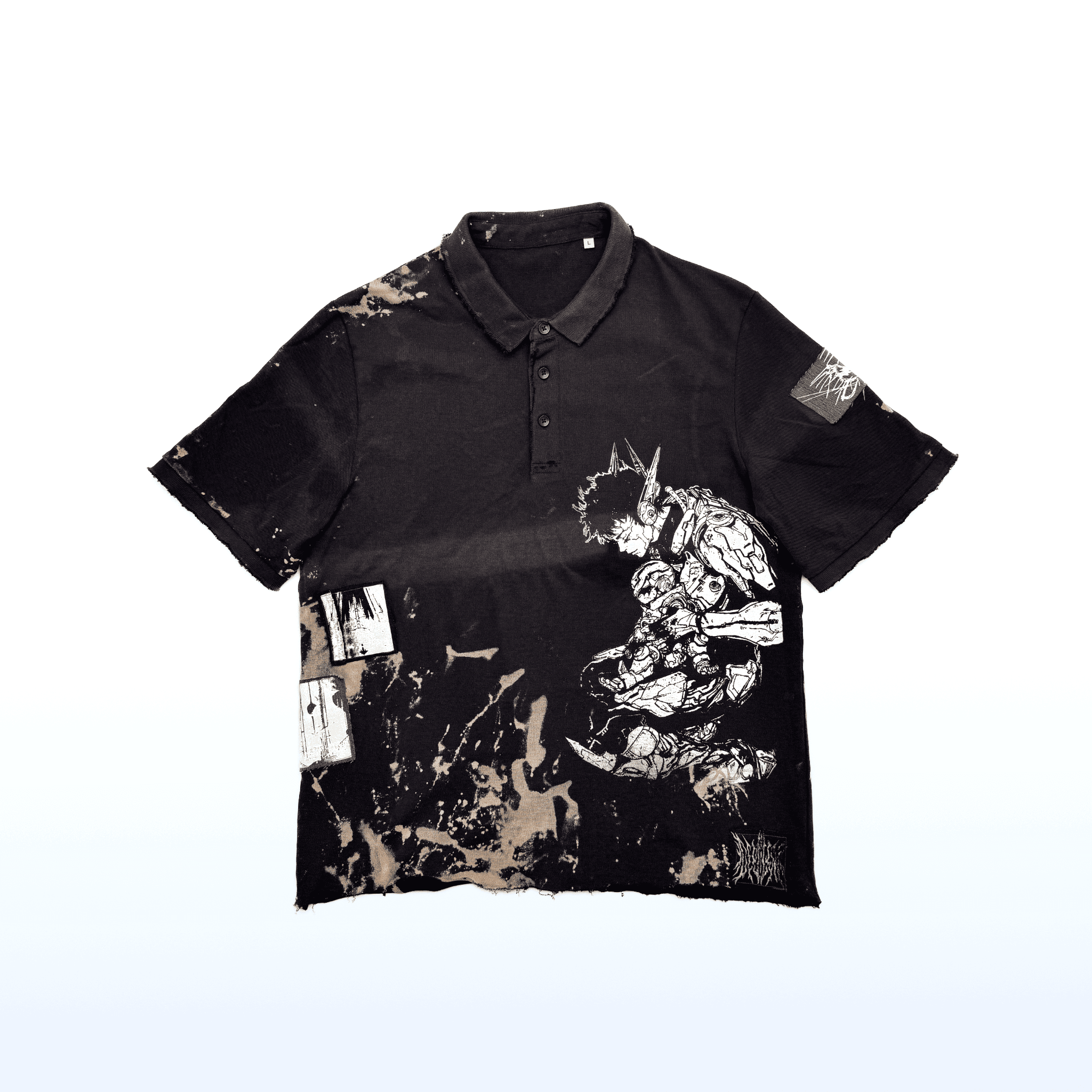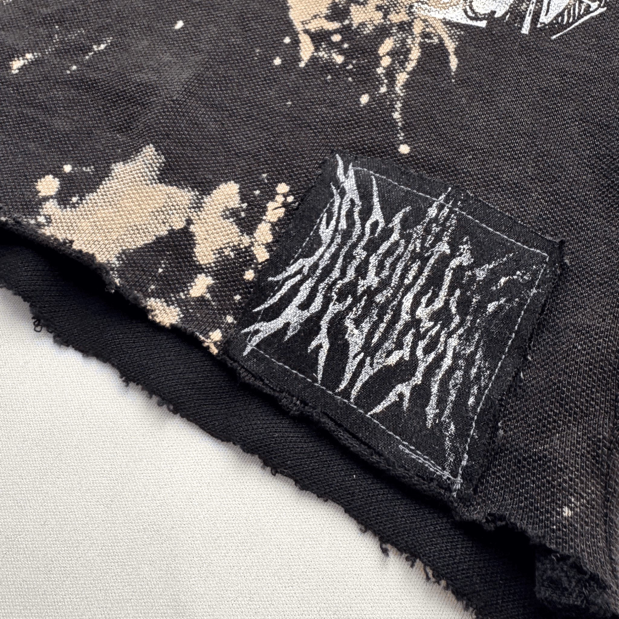Customization techniques: bleached, screen print, sewn-on patches